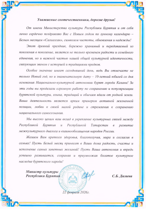 Министр культуры Республики Бурятия Соелма Дагаева направила поздравительное письмо в адрес национально-культурной автономии бурят г.Казани. В своем поздравлении министр подчеркнула, что десятилетний юбилей организации — это свидетельство огромной работы по сохранению родного языка и традиций вдали от родины.