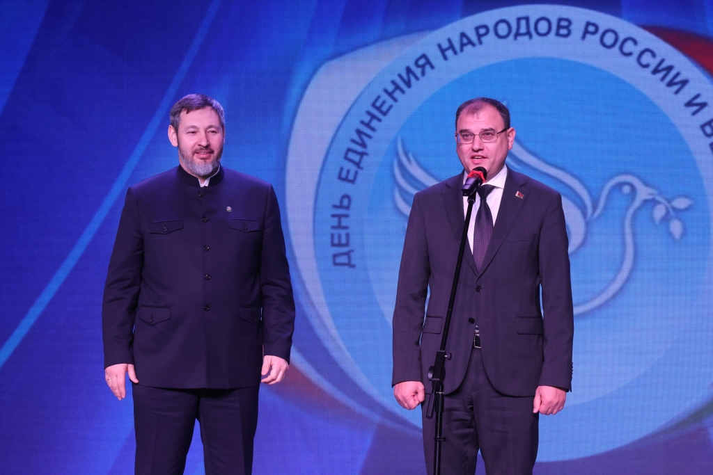 Торжественное мероприятие в честь Дня единения народов России и Беларуси продолжилось концертной программой – её открыли вокально-хореографической композицией «Беларусь и Россия», в исполнении Народного хора «Русская песня» (руководитель Заслуженный работник культуры РТ Светлана Измайлова), Театра танца «Сайдаш» (руководитель Народный артист РТ Тагир Латифуллин), Инструментального ансамбля «Мирас» (руководитель Заслуженный артист РТ Рустем Рахматуллин) и артистов Унитарного предприятия «Витебскоблгаз» из Беларуси.