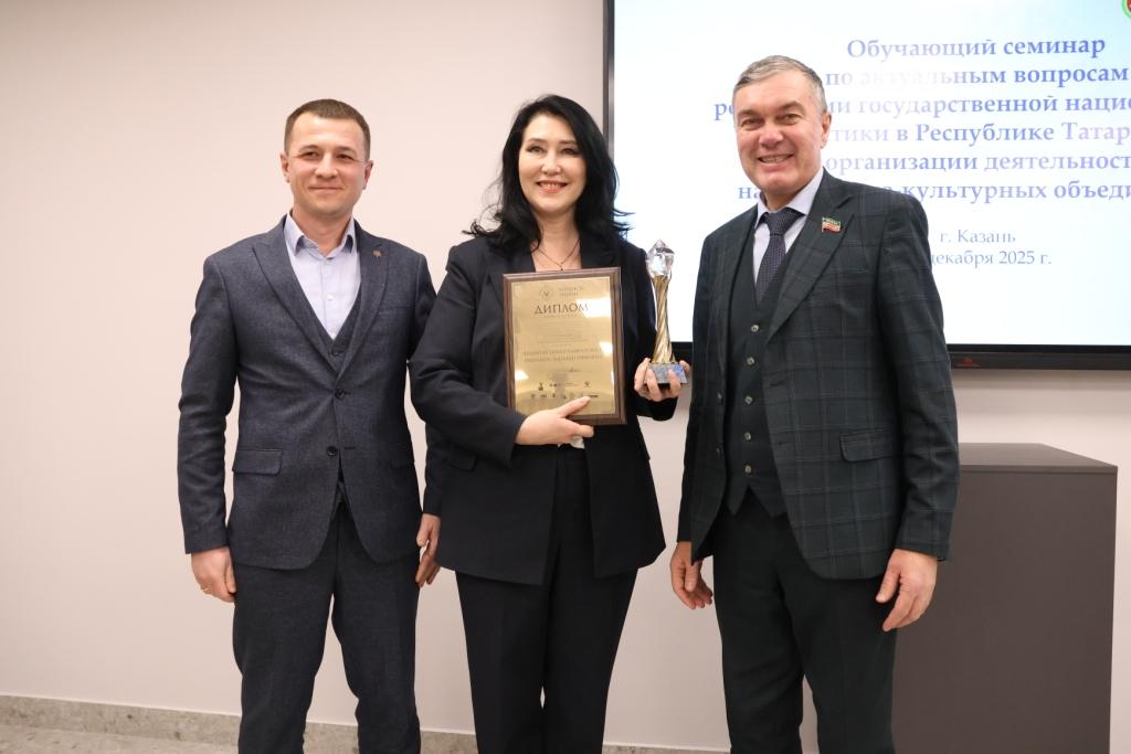 Накануне Директор Дома Дружбы народов Татарстана Тимур Кадыров и Руководитель Исполкома Совета Ассамблеи народов Татарстана Ренат Валиуллин передали награду за победу в VI Всероссийской общественной премии «Гордость нации — 2025» директору Дома Дружбы народов г.Набережные Челны «Родник» Ландыш Ишалиной.