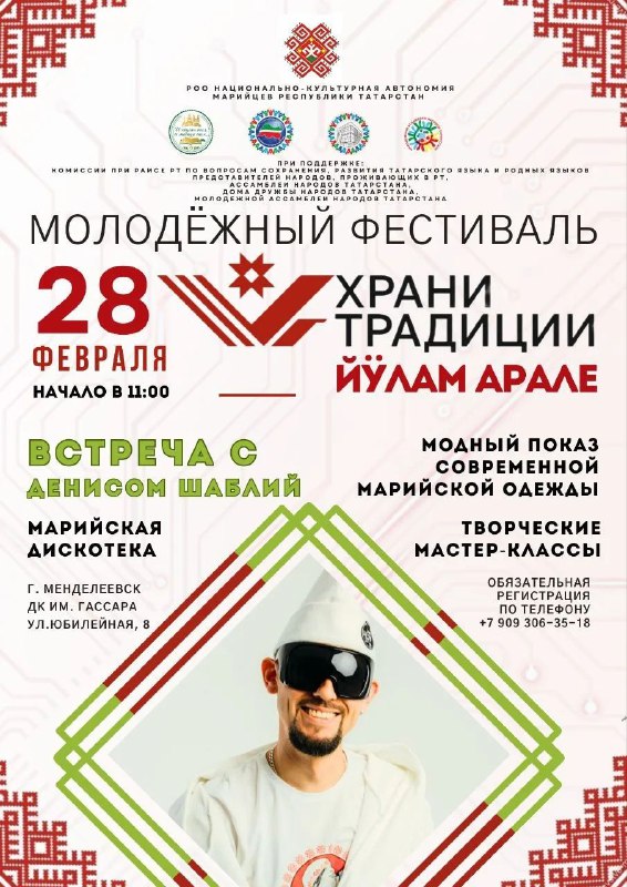 28 февраля 2026 года в концертном зале МАУ «Дворец культуры им. С. Гассара» г. Менделеевск состоится Фестиваль марийской молодежи «Храни традиции». Организатором фестиваля выступает Национально-культурная автономия марийцев РТ при поддержке Республиканского ресурсного центра по поддержке социально ориентированных некоммерческих организаций совместно с Республиканской комиссией по проведению конкурсов на предоставление грантов Раиса РТ на развитие гражданского общества, а также при поддержке Ассамблеи и Дома Дружбы народов Татарстана.